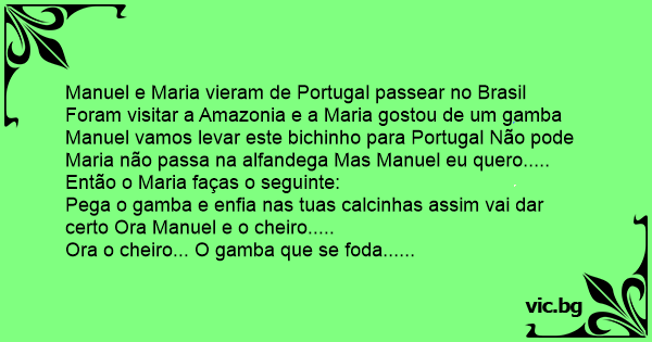 Manuel e Maria vieram de Portugal passear no Brasil Foram visitar a Amazonia e a Maria gostou de um gamba Manuel vamos levar este bichinho para Portugal Não pode Maria não passa na alfandega Mas Manuel eu quero.....