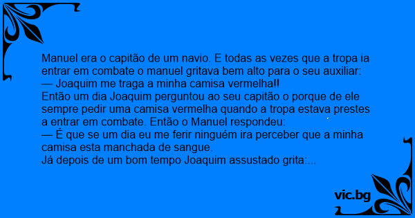 Então um dia Joaquim perguntou ao seu capitão o porque de ele sempre pedir uma camisa vermelha quando a tropa estava prestes a entrar em combate. Então o Manuel respondeu: