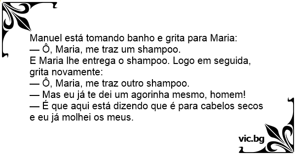 Шампон La rubia, el shampoo y el pelo mojado Los gallegos y el champu Блондинка се провиква от банята: Блондинка започва мие косата си с шампоан, но в банята влиза нейна приятелка. - Петьо, имаме ли друг шампоан? Две блондинки са в квартирата си. Едната се провиква: Две блондинки под душа: Zwei Blondinen unter der Dusche: Sind zwei Blondinen in der Dusche. Sagt die eine zur anderen: Le dice Pepito a su madre: Por que a Loira toma banho com o chuveiro desligado? Después de un partido de tenis Manolo y Pepe se duchan en el club... - Manolo, ¿me puedex dar un poco de tu Champú? - Pero tú tienes el tuyo, ¿se te ha acabado? - No. Pero el mío dice "para cabello seco”, y yo lo tengo lodo mojado. Se están bañando dos atlantes en las regaderas del club, y Manolo dice: ¿Me podéis dar un poco de tu shampoo? Oye, pero si tú tienes el tuyo, ¿Acaso se te ha acabado? No, pero mira, el mío dice:... A blond was taking a shower and her husband called in and asked "did you find the new dry hair shampoo I picked up for you?" And the blond replied "yes but there's a problem I already got my hair wet" -Oye Manolo, ¿Me prestas tu champú? - Pero si tú tienes. - Sí, pero el mío dice para cabellos secos y el mío está mojado... Un atlante le dice a otro: - Oye Manolo, pásame otro champú. - Pero, si ahí en el baño hay uno. - Sí hombre, ¡pero este es para cabello seco y yo ya me lo he mojado! Due bionde fanno la doccia e una chiede all’altra: ‘Puoi passarmi lo shampoo per favore?’. ‘Ma se ne hai già uno!?’. ‘Sì, ma è per capelli secchi e io li ho bagnati!’ Дві блондинки в душі: — Передай мені, будь ласка, шампунь. — Але у тебе ціла пляшка в руці! — Це для сухого волосся, а я їх вже намочила. Estaban dos piuranos bañandose en un club de futfol y... - Oye Pancho ¿me prestas tu shampoo? - Pero Pedro tu tienes el tuyo - Si pero el mio dice para cabello seco y yo lo tengo todo mojado. Дві блондинки у квартирі. Одна у ванній миється й кричить звідти: — Олю, дай шампунь. — Там же у ванній повно шампуню. — Так тут на всіх написано "для сухого волосся", а я вже намочила. Estos son de dos peruanos duchandose y uno le pregunta si le deja su champu y el otro peruano le pregunta por que si el tiene y el le responde Que en el suño pone para cabello seco y el lo tenia... Blondýnka je ve vaně a volá na spolubydlící: „Katko, přines mi, prosím tě, šampon!” „Ale vždyť už jich máš u vany pět,” upozorní ji kamarádka. „Já vím, ale na všech je napsané, že jsou na suché... Temel duş almaya girer, şampuanı saçlarına boşaltıp ovalamaya başlar. Sırtını keselemeye gelen annesi sorar : - Oğlum kafanı ıslatmıyacak mısın ?.. Temel cevap verir : - Yok anne bu şampuan kuru... Blondinen til den anden blondine: Hvad laver du? -  Jeg er lige i bad. -  Jamen du har ikke tændt vandet? -  Nej da, der står “Tørt hår” på denne shampoo Temel bir gün banyoya girmiş. Ama su akmıyormuş. Annesi sormuş. - Oğlum neden suyu açmadan şampuanla saçını yıkıyorsun?temel. - Anacığım bu şampuan kuru saçlar içinmiş. Xd :d Żona do męża: - Kochanie, podaj mi szampon. - Przecież butelka stoi zaraz koło ciebie. - Wiem, ale podaj mi inny, bo ten jest do włosów suchych, a moje są mokre... Deux blondes prennent leur douche ensemble. L'une demande : - Peux-tu me prêter ton shampoing ? L'autre lui dit : - Tu en as un juste derrière toi! Et la première blonde répond : - Oui mais celui... Divas blondīnes dzīvo kopā. Viena no vannas istabas sauc: Atnes man lūdzu šampūnu! Otra: Kāpec? Vannas istaba taču ir pilna ar šampūniem. - Jā, bet te uz visiem rakstīts- sausiem matiem, bet es...
