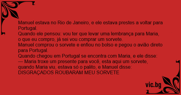 — Maria troxe um presente para você, esta aqui um sorvete, quando Maria viu, estava só o palito, e Manuel disse: DISGRAÇADOS ROUBARAM MEU SORVETE
