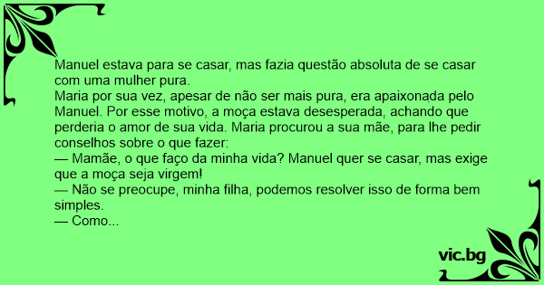 — Mamãe, o que faço da minha vida? Manuel quer se casar, mas exige que a moça seja virgem!