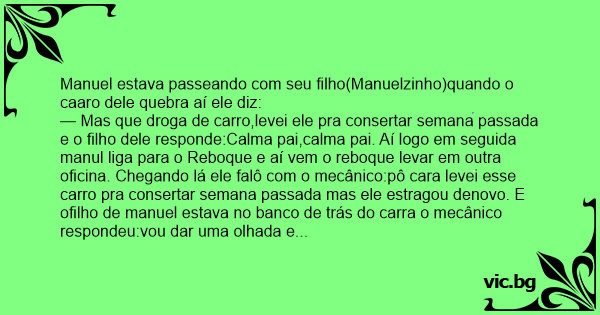 — Mas que droga de carro,levei ele pra consertar semana passada e o filho dele responde:Calma pai,calma pai. Aí logo em seguida manul liga para o Reboque e aí vem o reboque levar em outra oficina. Chegando lá ele falô com o mecânico:pô cara levei esse carro pra consertar semana passada mas ele estragou denovo. E ofilho de manuel estava no banco de trás do carra o mecânico respondeu:vou dar uma olhada e te falo logo em seguida o mecanico falô ó senhor vou ter q mexer no freio,e vamos ter q usar o burrinho.
