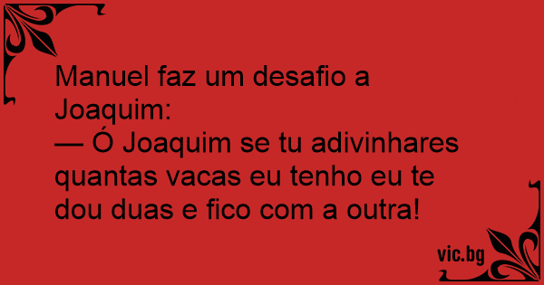 — Ó Joaquim se tu adivinhares quantas vacas eu tenho eu te dou duas e fico com a outra!