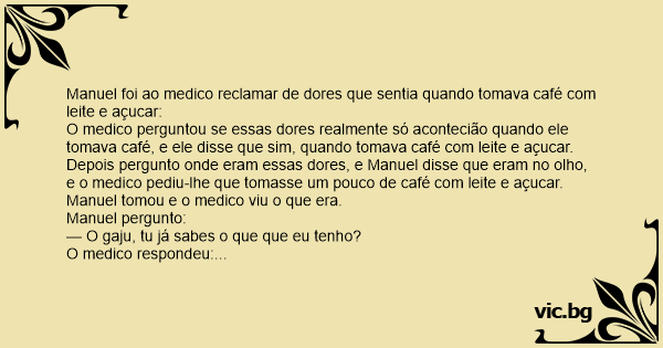 Manuel foi ao medico reclamar de dores que sentia quando tomava café com leite e açucar:
