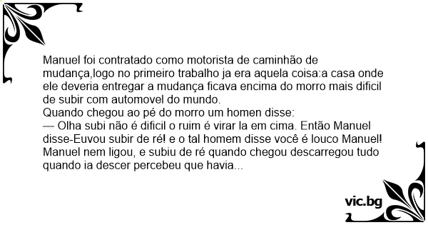 Manuel foi contratado como motorista de caminhão de mudança,logo no primeiro trabalho ja era aquela coisa:a casa onde ele deveria entregar a mudança ficava encima do morro mais dificil de subir com automovel do mundo.