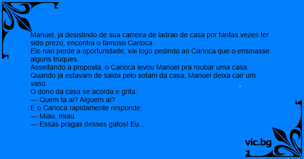 Feliz da vida, Manuel foi tentar roubar uma outra casa. Quando ja estava de saida, sem querer esbarrou numa cadeira que caindo fez aquele barulho. O dono da casa imediatamente acorda e grita: