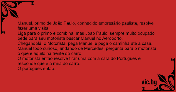 Liga para o primo e combina, mas Joao Paulo, sempre muito ocupado pede para seu motorista buscar Manuel no Aeroporto.