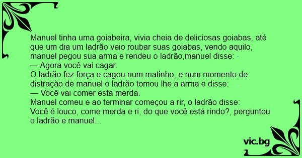 Manuel tinha uma goiabeira, vivia cheia de deliciosas goiabas, até que um dia um ladrão veio roubar suas goiabas, vendo aquilo, manuel pegou sua arma e rendeu o ladrão,manuel disse: