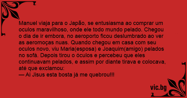 Manuel viaja para o Japão, se entusiasma ao comprar um oculos maravilhoso, onde ele todo mundo pelado. Chegou o dia de ir embora, no aeroporto ficou deslumbrado ao ver as aeromoças nuas. Quando chegou em casa com seu oculos novo, viu Maria(esposa) e Joaquim(amigo) pelados no sofá. Depois tirou o óculos e percebeu que eles continuavam pelados, e assim por diante tirava e colocava, até que exclamou: