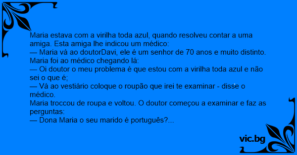 Maria estava com a virilha toda azul, quando resolveu contar a uma amiga. Esta amiga lhe indicou um médico: