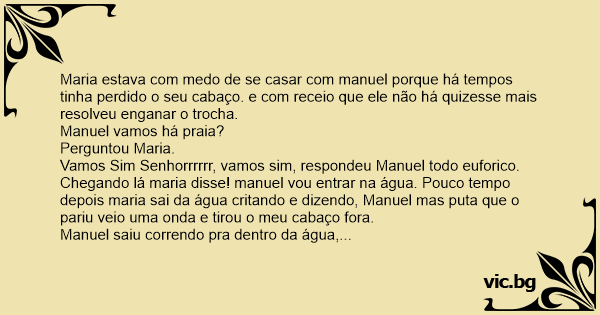 Chegando lá maria disse! manuel vou entrar na água. Pouco tempo depois maria sai da água critando e dizendo, Manuel mas рuта que o pariu veio uma onda e tirou o meu cabaço fora.