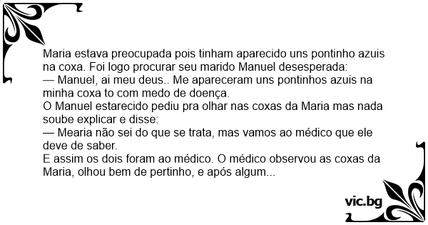 Maria estava preocupada pois tinham aparecido uns pontinho azuis na coxa. Foi logo procurar seu marido Manuel desesperada: