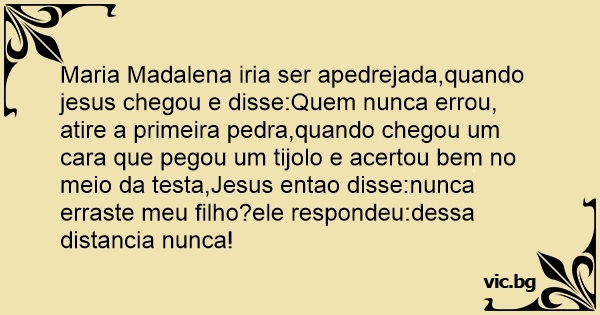 Maria Madalena iria ser apedrejada,quando jesus chegou e disse:Quem nunca errou, atire a primeira pedra,quando chegou um cara que pegou um tijolo e acertou bem no meio da testa,Jesus entao disse:nunca erraste meu filho?ele respondeu:dessa distancia nunca!
