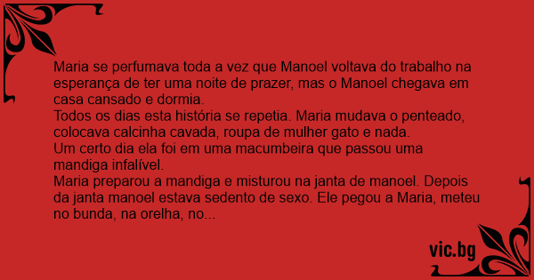 Maria preparou a mandiga e misturou na janta de manoel. Depois da janta manoel estava sedento de sеxо. Ele pegou a Maria, meteu no bunda, na orelha, no umbigo, no olho.... Maria alucinada disse: