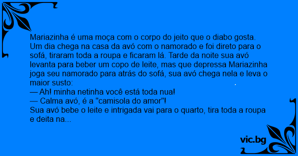 Mariazinha é uma moça com o corpo do jeito que o diabo gosta. Um dia chega na casa da avó com o namorado e foi direto para o sofá, tiraram toda a roupa e ficaram lá. Tarde da noite sua avó levanta para beber um copo de leite, mas que depressa Mariazinha joga seu namorado para atrás do sofá, sua avó chega nela e leva o maior susto: