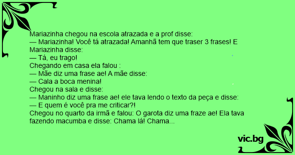 — Mariazinha! Você tá atrazada! Amanhã tem que traser 3 frases! E Mariazinha disse: