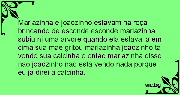 Mariazinha e joaozinho estavam na roça brincando de esconde esconde mariazinha subiu ni uma arvore quando ela estava la em cima sua mae gritou mariazinha joaozinho ta vendo sua calcinha e entao mariazinha disse nao joaozinho nao esta vendo nada porque eu ja direi a calcinha.