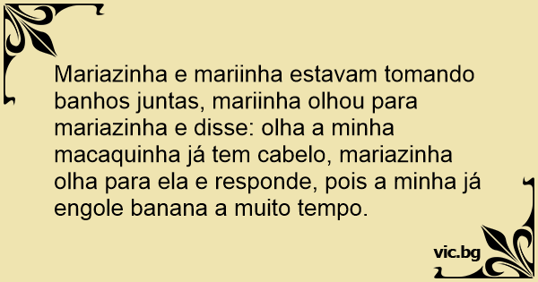 Mariazinha e mariinha estavam tomando banhos juntas, mariinha olhou para mariazinha e disse: olha a minha macaquinha já tem cabelo, mariazinha olha para ela e responde, pois a minha já engole banana a muito tempo.