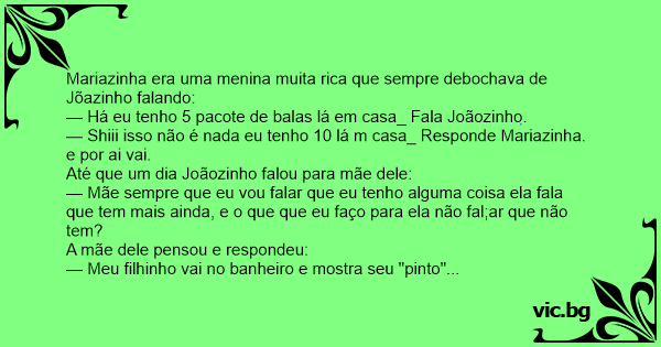 — Shiii isso não é nada eu tenho 10 lá m casa_ Responde Mariazinha. e por ai vai.