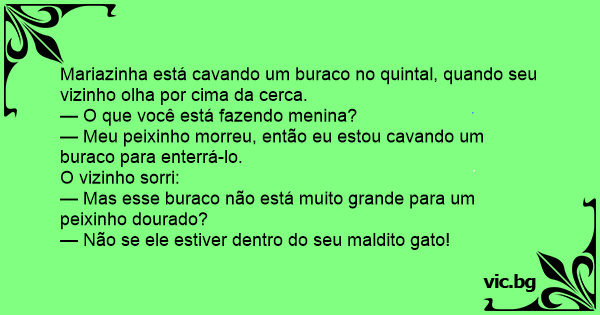 Um sujeito estava no jardim de sua casa quando vê o vizinho, no jardim ao lado, cavando um buraco. Curioso, ele se aproxima da cerca que divide as duas casas e pergunta ao vizinho: — O que você...