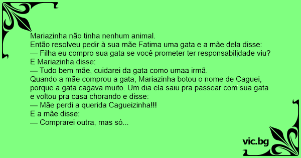Quando a mãe comprou a gata, Mariazinha botou o nome de Caguei, porque a gata cagava muito. Um dia ela saiu pra passear com sua gata e voltou pra casa chorando e disse: