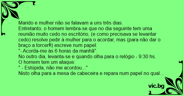 Entretanto, o homem lembra-se que no dia seguinte tem uma reunião muito cedo no escritório, (e como precisava se levantar cedo) resolve pedir à mulher para o acordar, mas (para não dar o braço a torcer!!) escreve num papel:
