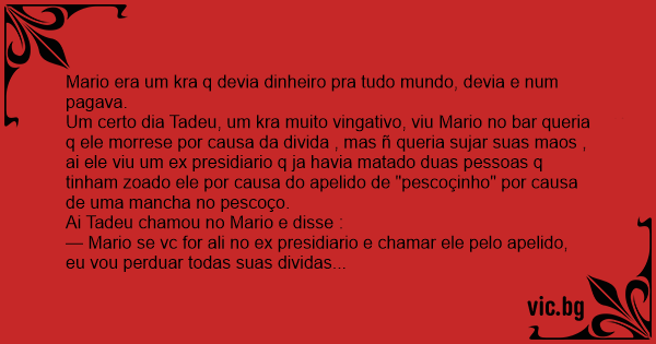 Um certo dia Tadeu, um kra muito vingativo, viu Mario no bar queria q ele morrese por causa da divida , mas ñ queria sujar suas maos , ai ele viu um ex presidiario q ja havia matado duas pessoas q tinham zoado ele por causa do apelido de "pescoçinho" por causa de uma mancha no pescoço.