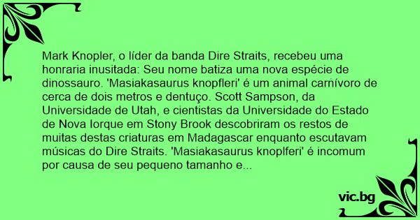 Mark Knopler, o líder da banda Dire Straits, recebeu uma honraria inusitada: Seu nome batiza uma nova espécie de dinossauro. 'Masiakasaurus knopfleri' é um animal carnívoro de cerca de dois metros e dentuço. Scott Sampson, da Universidade de Utah, e cientistas da Universidade do Estado de Nova Iorque em Stony Brook descobriram os restos de muitas destas criaturas em Madagascar enquanto escutavam músicas do Dire Straits. 'Masiakasaurus knoplferi' é incomum por causa de seu pequeno tamanho e seus dentes e maxilares inusitados. O dente principal do maxilar inferior projeta-se para fora, e não para cima, e os incisivos são alongados e cônicos enquanto que os molares são achatados e serrilhados. 'Este é uma nova espécie de dinossauro. Uma das coisas curiosas sobre ele é que seus parentes mais próximos estão na distante Argentina'', explicou Scott. 'Isso significa que podem ter existido conexões de terra entre uma boa parte do Hemisfério Sul até pouco tempo antes da época em que estes animais viveram'', acrescentou. A descoberta está relatada na última edição da revista 'Nature'.