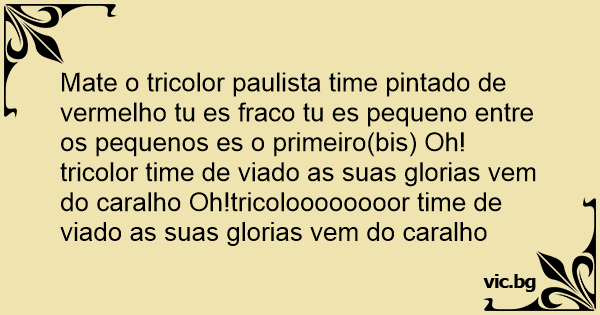 Mate o tricolor paulista time pintado de vermelho tu es fraco tu es pequeno entre os pequenos es o primeiro(bis) Oh!tricolor time de viаdо as suas glorias vem do саrаlhо Oh!tricoloooooooor time de viаdо as suas glorias vem do caralho