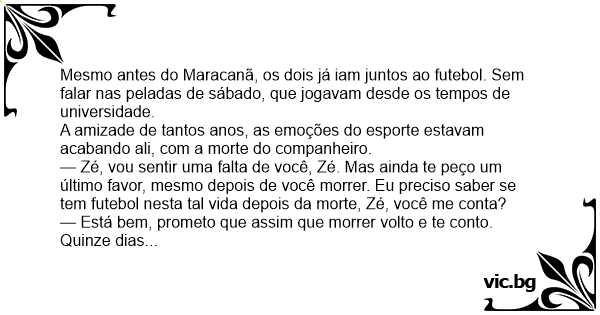 — Zé, vou sentir uma falta de você, Zé. Mas ainda te peço um último favor, mesmo depois de você morrer. Eu preciso saber se tem futebol nesta tal vida depois da morte, Zé, você me conta?