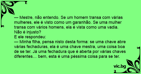 Ji: - Pasakyk man, kodėl jei vaikinas turėjo daug merginų, jis – kietas, bet jei mergina turėjo daug vaikinų – tai ji kur*a? Jis: - Supranti, jei vienas raktas atrakina daug spynų – tai puikus...