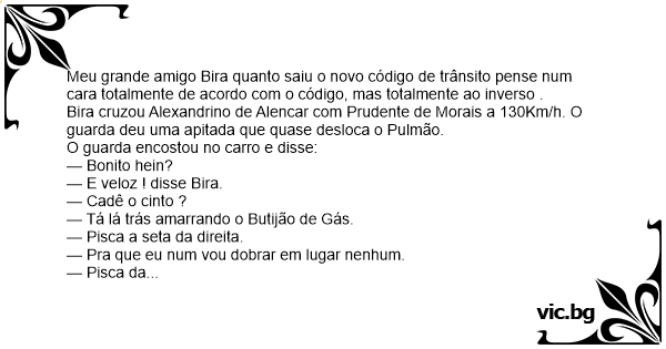 Meu grande amigo Bira quanto saiu o novo código de trânsito pense num cara totalmente de acordo com o código, mas totalmente ao inverso .