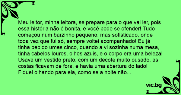 Meu leitor, minha leitora, se prepare para o que vai ler, pois essa história não é bonita, e você pode se ofender! Tudo começou num barzinho pequeno, mas sofisticado, onde toda vez que fui só, sempre voltei acompanhado! Eu já tinha bebido umas cinco, quando a vi sozinha numa mesa, tinha cabelos louros, olhos azuis, e o corpo era uma beleza! Usava um vestido preto, com um decote muito ousado, as costas ficavam de fora, e havia uma abertura do lado! Fiquei olhando para ela, como se a noite não tivesse fim, de repente nossos olhos se cruzam e ela sorri para mm! Olhando para os lábios carnudos, já comecei a pensar bobagem, entornei o copo de uísque, pois, precisava criar coragem! Levantei-me da banqueta e decidido, caminhei até a mesa, com os passos de um felino, para cercar minha presa! Parei diante dela acabrunhado, sem saber o que falar, com um gesto magnânimo, ela convidou-me a sentar! A conversa correu solta, e eu não parva de olhar, para o decote apertado, donde os seios queriam saltar! Quando começou a madrugada, eu já bastante embriagado, colei minhas coxas na dela, e dei-lhe um abraço apertado! Ao sentir as costas nuas, estremeci de satisfação, senti o meu раu se erguendo, pronto para entrar em ação! Segurando aquele queixo redondo, beijei os lábios daquela felina, e ao sentir sua língua quente, disparou minha adrenalina! Sem mais poder me conter, convencido de que iria aceitar, convidei-a para um motel, para a brincadeira começar! Ela olhou-me sem espanto sem se fazer de rogada, e num doce murmúrio, disse: