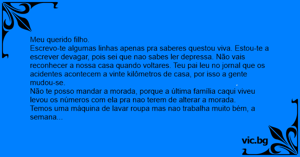 Escrevo-te algumas linhas apenas pra saberes questou viva. Estou-te a escrever devagar, pois sei que nao sabes ler depressa. Não vais reconhecer a nossa casa quando voltares. Teu pai leu no jornal que os acidentes acontecem a vinte kilômetros de casa, por isso a gente mudou-se.