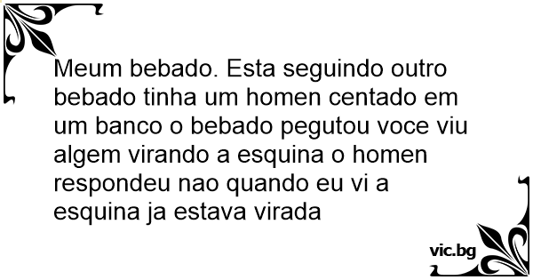 Meum bebado. Esta seguindo outro bebado tinha um homen centado em um banco o bebado pegutou voce viu algem virando a esquina o homen respondeu nao quando eu vi a esquina ja estava virada