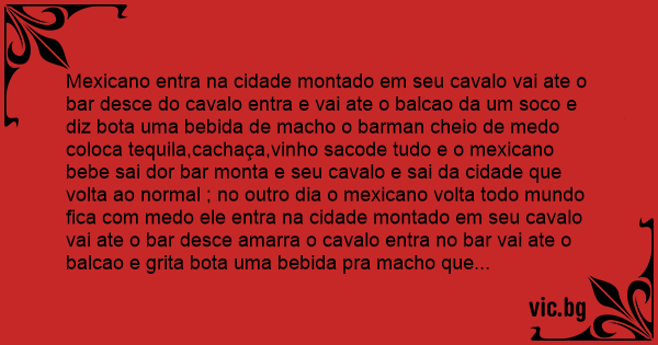 Mexicano entra na cidade montado em seu cavalo vai ate o bar desce do cavalo entra e vai ate o balcao da um soco e diz bota uma bebida de macho o barman cheio de medo coloca tequila,cachaça,vinho sacode tudo e o mexicano bebe sai dor bar моnта e seu cavalo e sai da cidade que volta ao normal ; no outro dia o mexicano volta todo mundo fiса com medo ele entra na cidade montado em seu cavalo vai ate o bar desce amarra o cavalo entra no bar vai ate o balcao e grita bota uma bebida pra macho que aquela que tu me deu ontem nao tava com nada ai o barman cheio de medo coloca querosene,gasolina,cachaça e duas balas de revolver sacode tudo e o mexicano bebe tudo de uma vez e vai embora da cidade montado em seu cavalo.