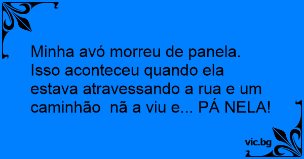 Minha avó morreu de panela.<br />Isso aconteceu quando ela estava atravessando a rua e um caminhão nã a viu e... PÁ NELA!