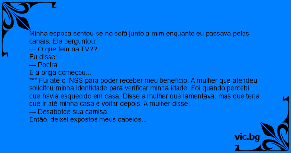 Minha esposa sentou-se no sofá junto a mim enquanto eu passava pelos canais. Ela perguntou: