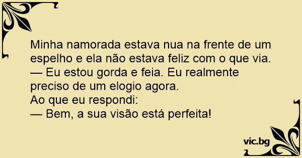O Marido chega para a esposa: " estou tão velho, feio, trite, gordo...preciso de um elogio." Ela: "Você tem uma ótima visão!"