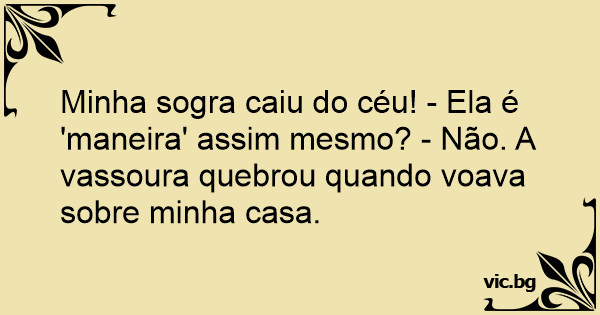 Minha sogra caiu do céu! - Ela é 'maneira' assim mesmo? - Não. A vassoura quebrou quando voava sobre minha casa.