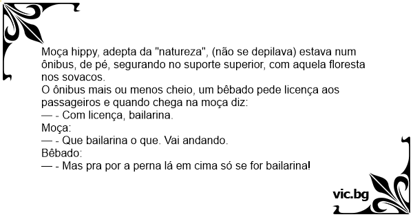 O ônibus mais ou menos cheio, um bêbado pede licença aos passageiros e quando chega na moça diz: