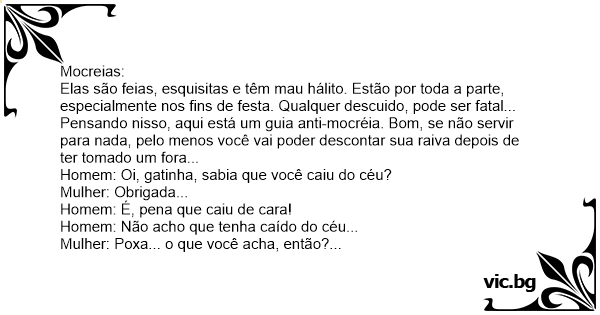 Pensando nisso, aqui está um guia anti-mocréia. Bom, se não servir para nada, pelo menos você vai poder descontar sua raiva depois de ter tomado um fora...