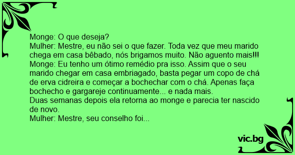 Monge: Eu tenho um ótimo remédio pra isso. Assim que o seu marido chegar em casa embriagado, basta pegar um copo de chá de erva cidreira e começar a bochechar com o chá. Apenas faça bochecho e gargareje continuamente... e nada mais.