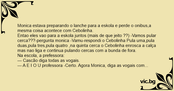 Entao eles vao para a eskola juntos (mais de que jeito ??) -Vamos pular cerca???-pergunta monica -Vamu-respondi o Cebolinha Pula uma,pula duas,pula tres,pula quatro ,na quinta cerca o Cebolinha enrosca a calça mas nao liga e continua pulando cercas com a bunda de fora.