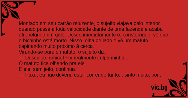 Montado em seu carrão reluzente, o sujeito viajava pelo interior quando passa a toda velocidade diante de uma fazenda e acaba atropelando um galo. Desce imediatamente e, consternado, vê que o bichinho está morto. Nisso, olha de lado e vê um matuto capinando muito próximo à cerca.
