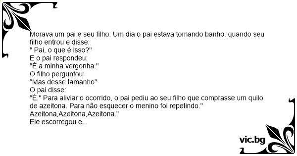 "É." Para aliviar o ocorrido, o pai pediu ao seu filho que comprasse um quilo de azeitona. Para não esquecer o menino foi repetindo." Azeitona,Azeitona,Azeitona."