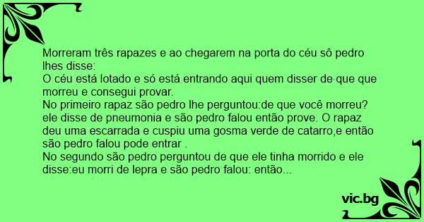 No primeiro rapaz são pedro lhe perguntou:de que você morreu?ele disse de pneumonia e são pedro falou então prove. O rapaz deu uma escarrada e cuspiu uma gosma verde de catarro,e então são pedro falou pode entrar .
