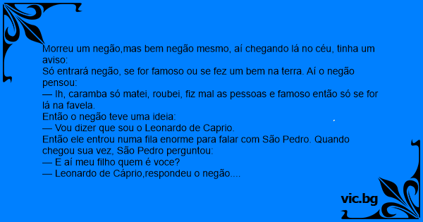 Uma vez um negão morreu e foi pro céu chegando lá bateu na porta São Pedro, o atendeu e perguntou: — Quem é? E ele respondeu: — Leonardo di Caprio. São Pedro disse: — Espere um minutinho só! E em...