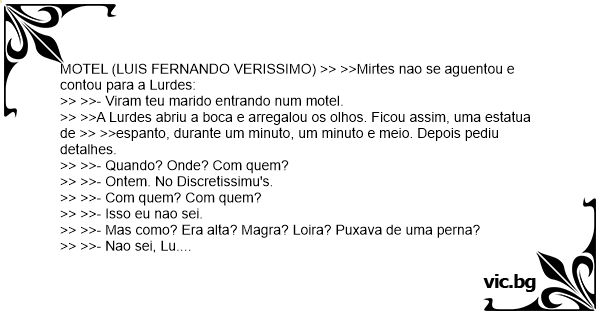 MOTEL (LUIS FERNANDO VERISSIMO) >> >>Mirtes nao se aguentou e contou para a Lurdes: