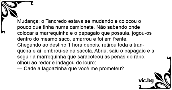 Mudança: o Tancredo estava se mudando e colocou o pouco que tinha numa camionete. Não sabendo onde colocar a marrequinha e o papagaio que possuia, jogou-os dentro do mesmo saco, amarrou e foi em frente.